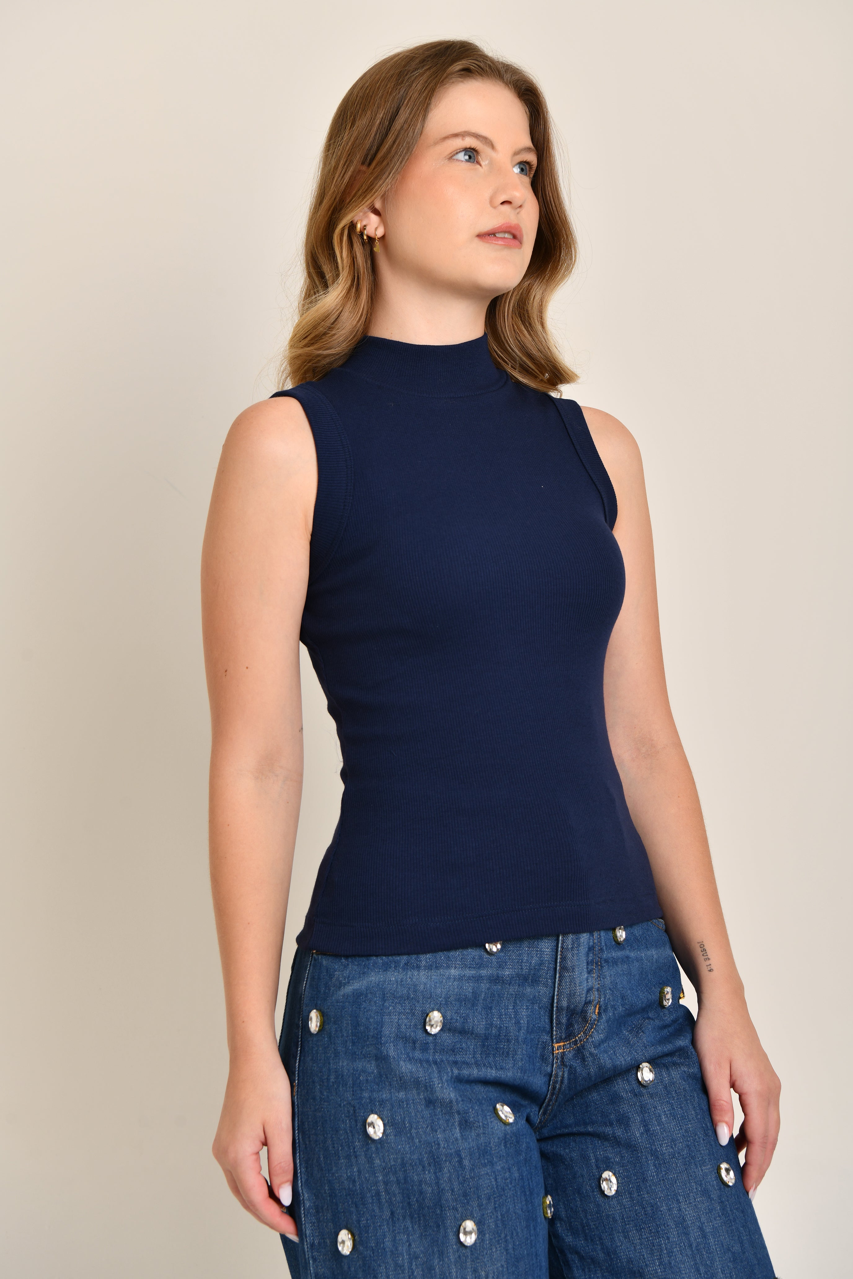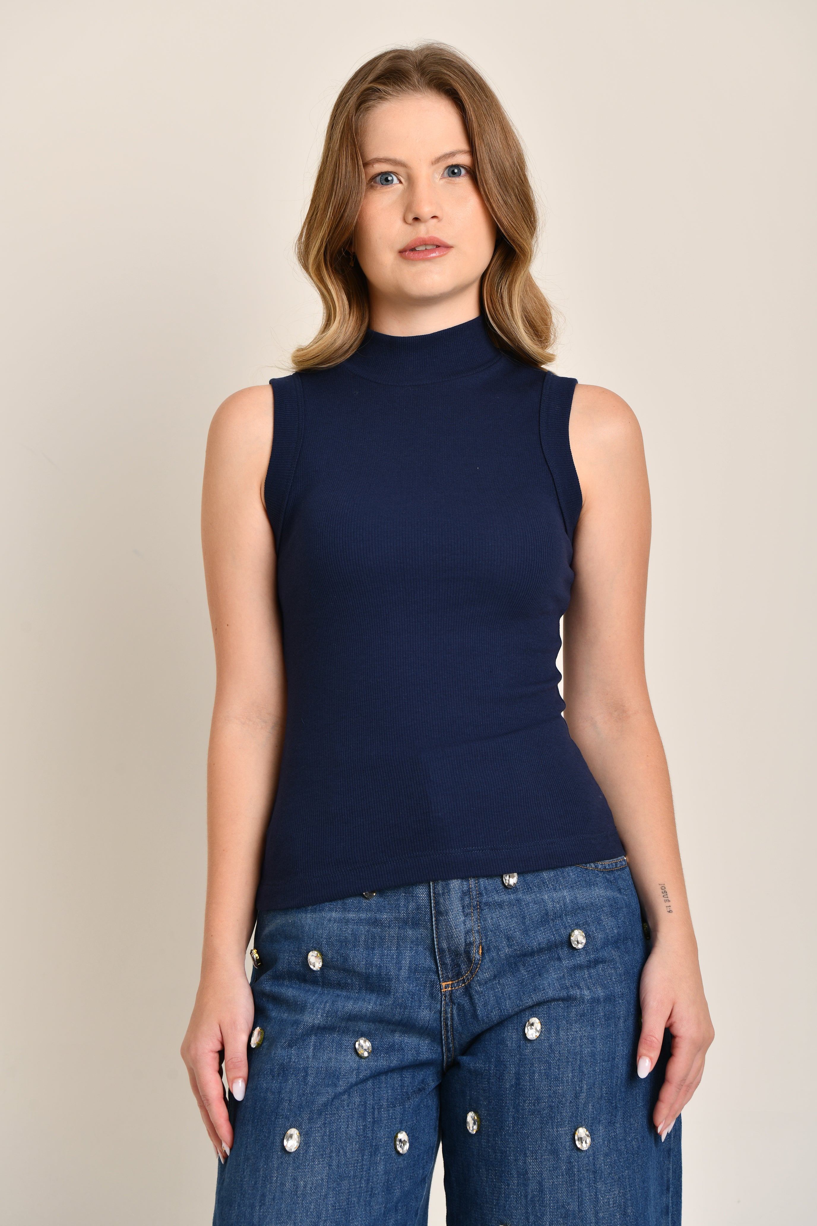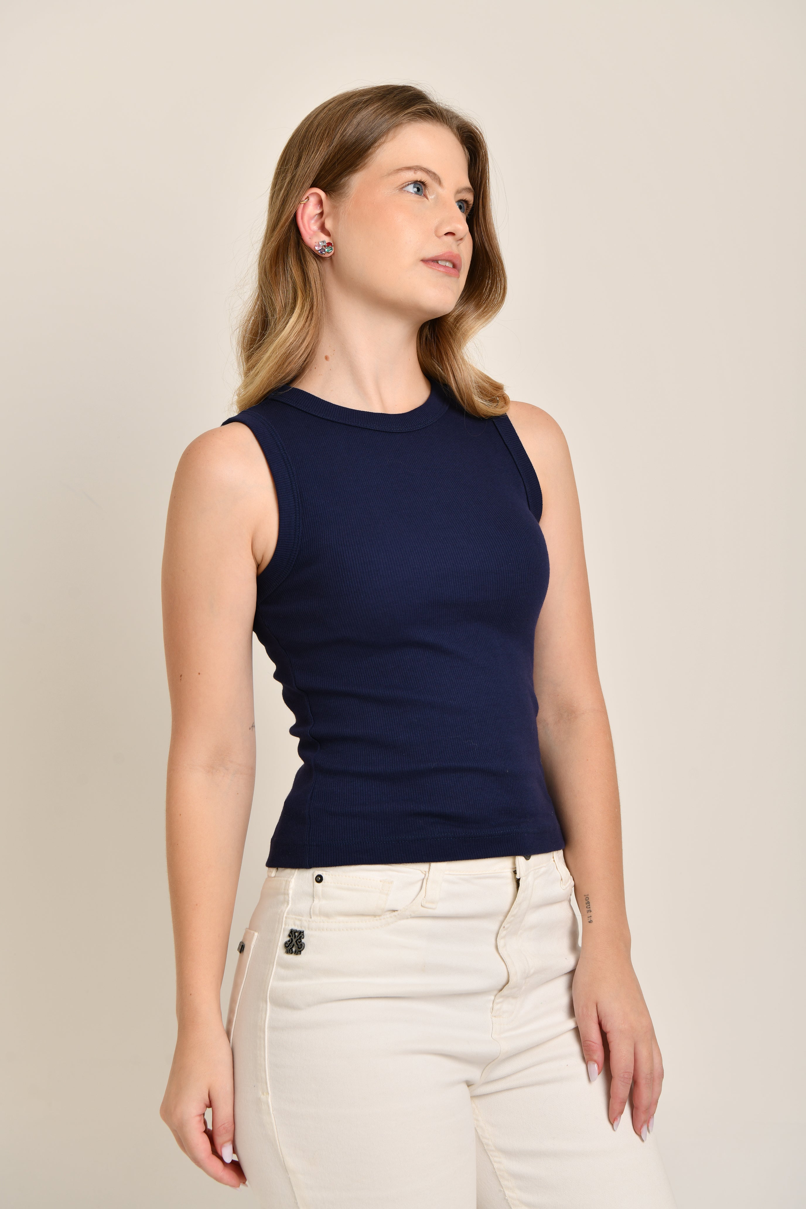 Regata Feminina Canelada Gola Alta Lilian Azul
