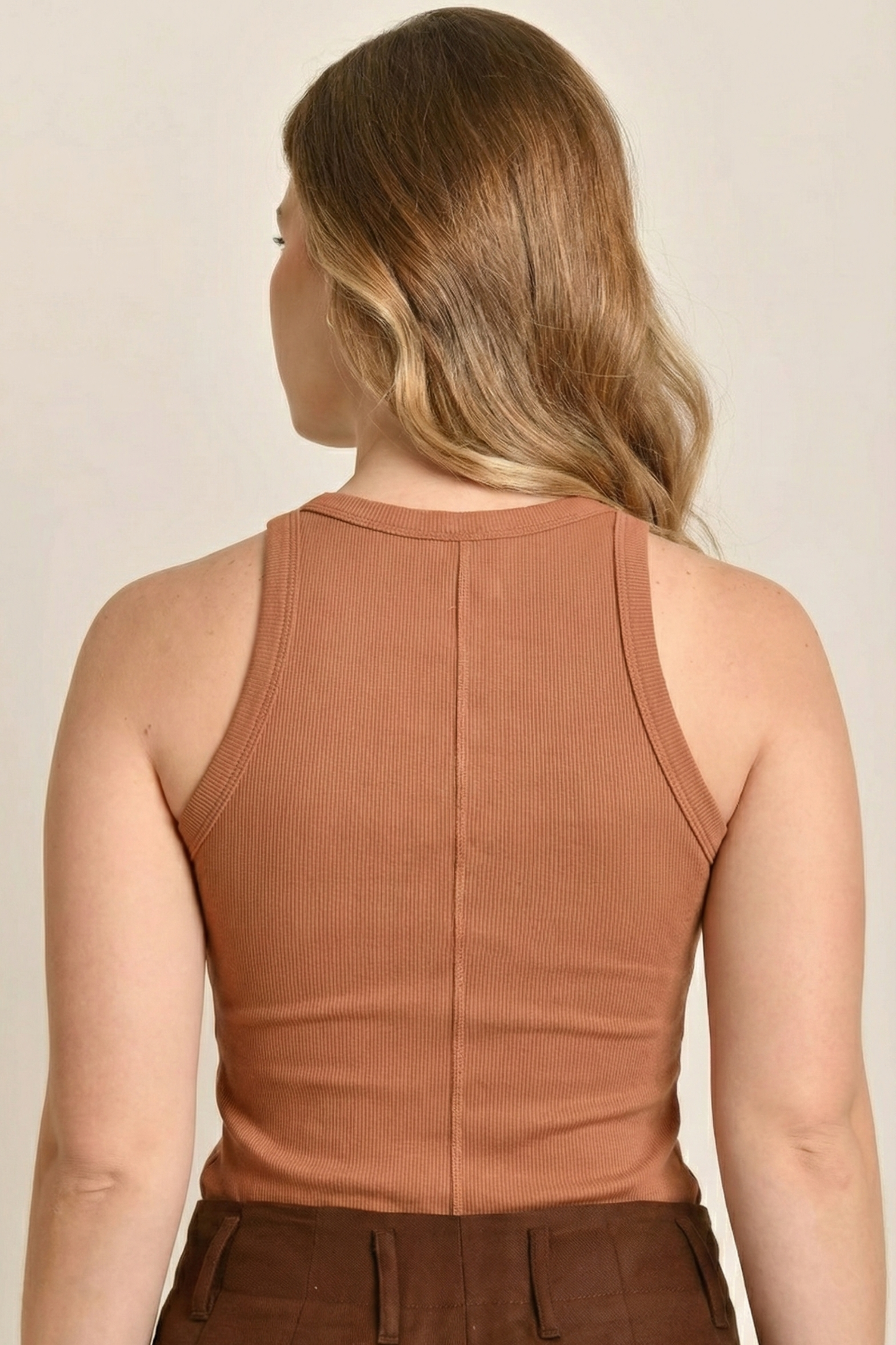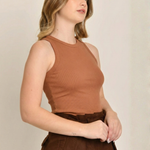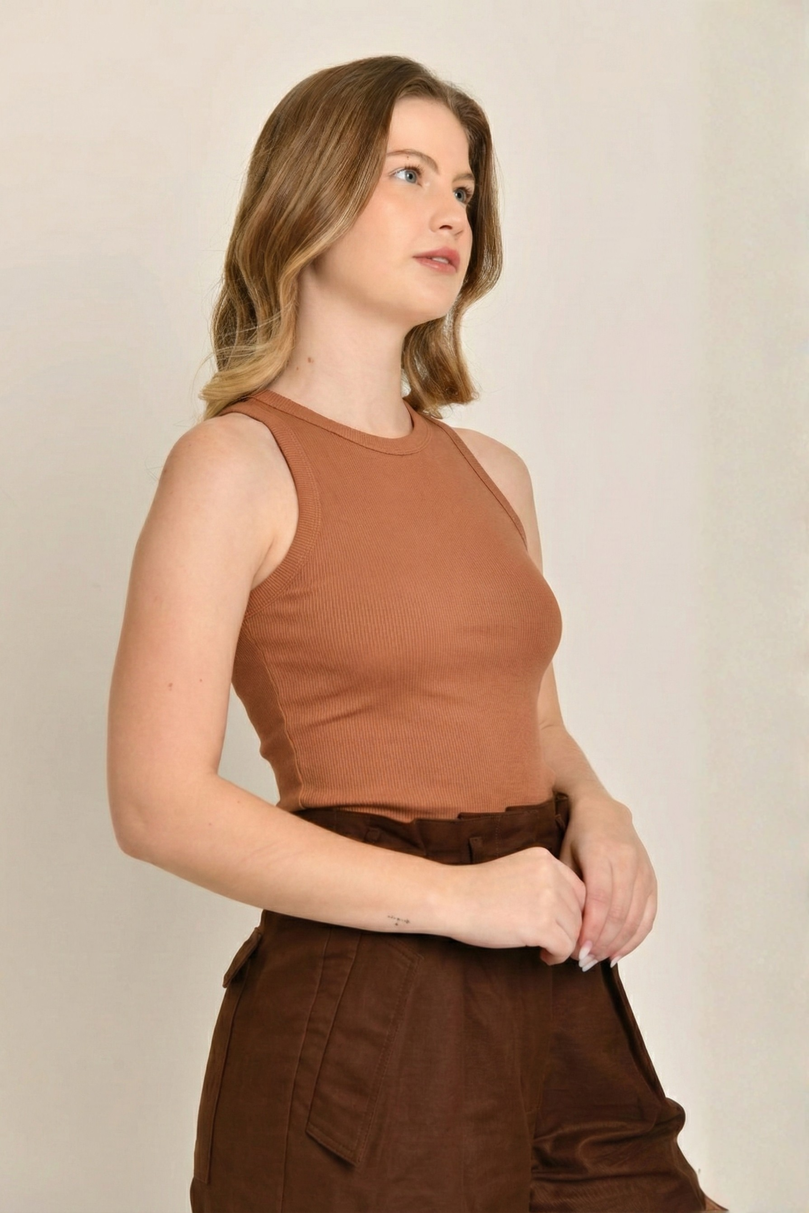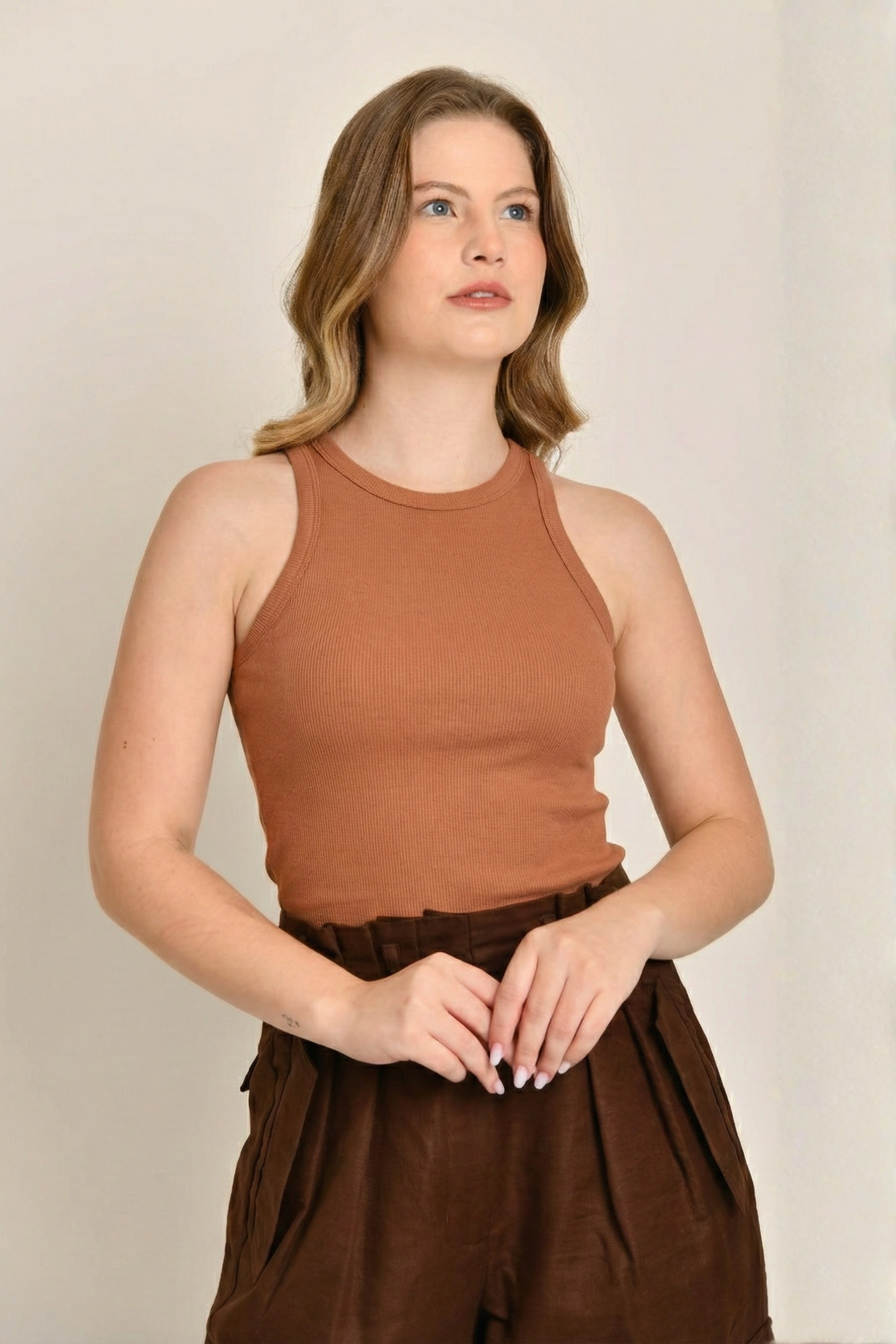 A Regata Sofia é confeccionada em malha canelada (ribana) de algodão premium, garantindo caimento impecável e liberdade total de movimento. O toque macio e a alta durabilidade do tecido proporcionam conforto durante todo o dia, sem abrir mão da sofisticação.
